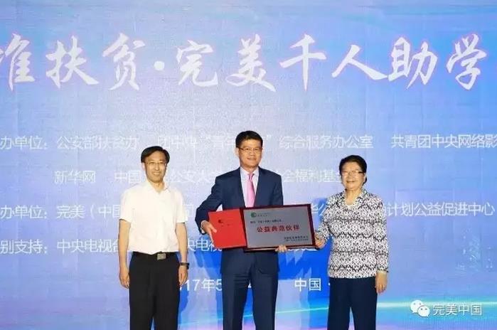 直销行业网讯 为响应国家“精准扶贫”指示精神,2017年5月24日,“授渔计划•青年之声”精准扶贫完美千人助学行动在京全面启动。完美公司现场捐赠600万元善款,用于资助江西、四川、贵州、湖北、甘肃等地的1000名贫困学生,资助其接受职业教育,并为学生成长提供后续的就业支持与再教育服务,为贫困地区经济发展培养职业人才,同时也通过公益行动帮助贫困地区如期完成脱贫攻坚目标,促进困境青少年健康成长。第十届全国人大常委会副委员长、中国关心下一代工作委员会主任顾秀莲为完美公司颁发“授渔计划公益典范伙伴”的牌匾及证书。