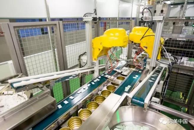 去年,完美公司迎来两个FANUC机器人,它们最快可以120罐/分钟的速度,为每一罐食品放置干燥剂和脱氧剂,被称为“高能员工”,仪器前方,还有一个视觉识别系统,自动影像检测、剔除次品。“‘机器换人’是产业转型升级的必由之路,既能够快速推进企业技术进步,又降低了用工和生产经营成本,提高劳动生产效率。”据刁爱兵经理介绍,“以前,38位员工人工装箱,每分钟平均装60罐;现在,自动化装箱速度提升到每分钟100罐,仅有8位员工负责日常监测。”