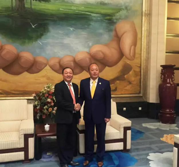 天狮集团董事长李金元先生与圣辉堂医疗集团郭志荣先生就签约成功握手庆祝