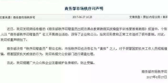 直销行业网讯 6月27日,商务部市场秩序司发布声明:“近日,我司发现网络传播的《商务部秩序司稽查员出现在沸点教育微商实战操盘手训练营首肯微商》报道中,个别人以“商务部秩序司稽查员”名义开展商业活动,误导了企业和公众,给我司形象和正常工作造成了极坏影响。对此,我司郑重声明如下:商务部没有“秩序司稽查员”职位名称,市场秩序司也没有名为“黄炜”之人。对于假冒国家机关工作人员招摇撞骗,损害国家机关威信的行为,我司将提交公安部门进行调查处理。在此,我司提醒广大公众和企业注意维护自身维权,防止受骗。”