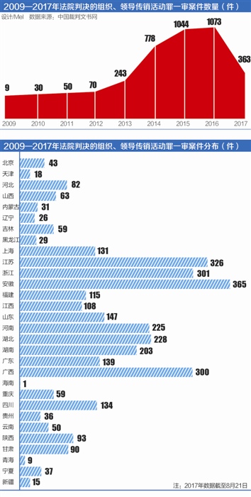 中国裁判文书网数据显示,组织、领导传销活动罪一审案件在2014年至2016年数量陡增,分别达到778、1044、1073件。