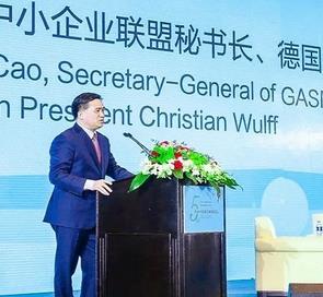 图:全球中小企业联盟秘书长、德国前总统武尔夫中国事务顾问曹方致辞演讲