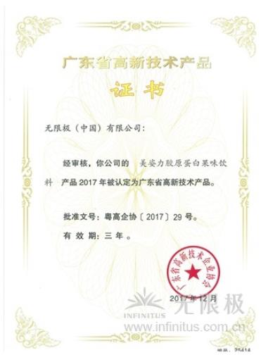 自2007年来,无限极已经连续11年有多款产品获广东省高新技术产品认定,这是政府对公司高品质中草药健康产品的肯定和对公司科技创新工作的认可;同时也提升了公司产品的美誉度,更好地助力业务市场,提升消费者对公司产品的信心,更是公司持续进行科技创新活动的动力!