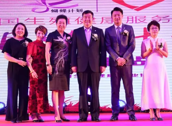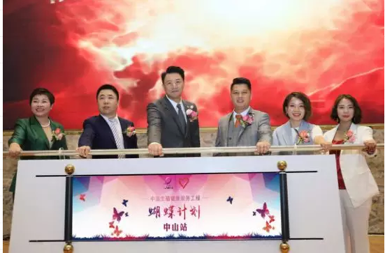 李南先生、侯旭刚先生、刘盛宇先生、Ada女士、孙明霞女士、胡祖翠女士上台进行中国生殖健康服务工程——三八妇乐蝴蝶计划中山站启动仪式。