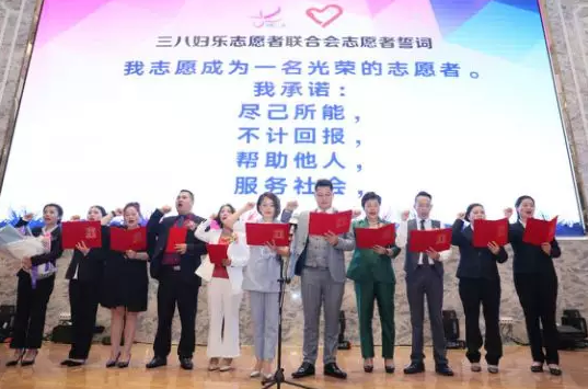 三八妇乐志愿者联合会分会长刘盛宇先生带领志愿者们宣誓。