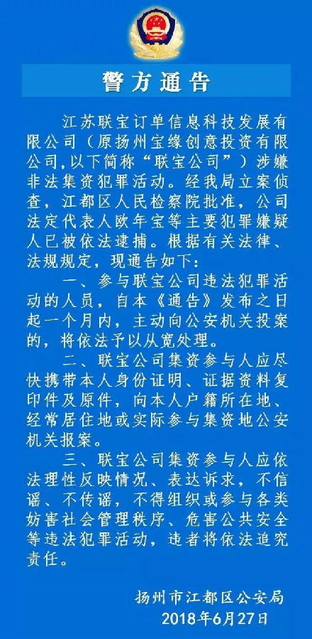 直销行业网讯 扬州江都警方于 6 月 27 日凌晨发布消息:根据群众举报,经公安机关全力侦查,江苏联宝订单信息科技发展有限公司(原扬州宝缘创意投资有限公司,以下简称 " 联宝公司 ")涉嫌非法集资犯罪。经检察机关批准,该公司法定代表人欧年宝等 22 名主要犯罪嫌疑人已被依法逮捕,案件正在进一步侦办中。