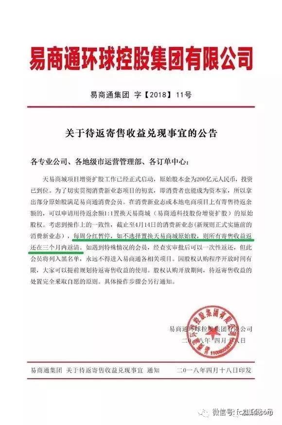 凤凰网财经获得的一份易商通红头文件对停止返现的说法是,公司已启动天易商城项目增资扩股工作,原始股本金为200亿元人民币。“考虑到操作上的一致性,截止至4月14日的消费新业态,每周分红暂停,如不选择置换天易商城原始股,则所有寄售收益返还在三个月内返清。”