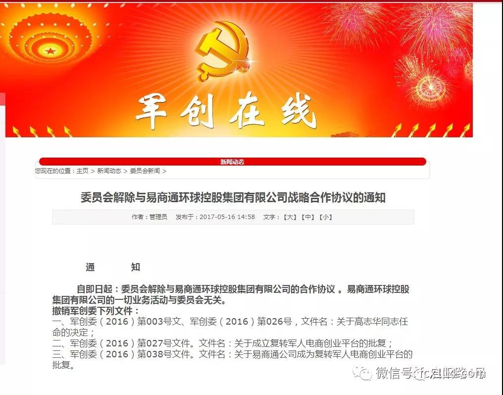 2017年5月16日,军创在线发布通知,“自即日起:委员会解除与易商通环球控股集团有限公司的合作协议。易商通环球控股集团有限公司的一切业务活动与委员会无关。”军创的全名为中国城乡复转军人创业工作委员会,而在2018年2月6日民政部公布的一批非法社会组织名单中,就有军创位列其中。