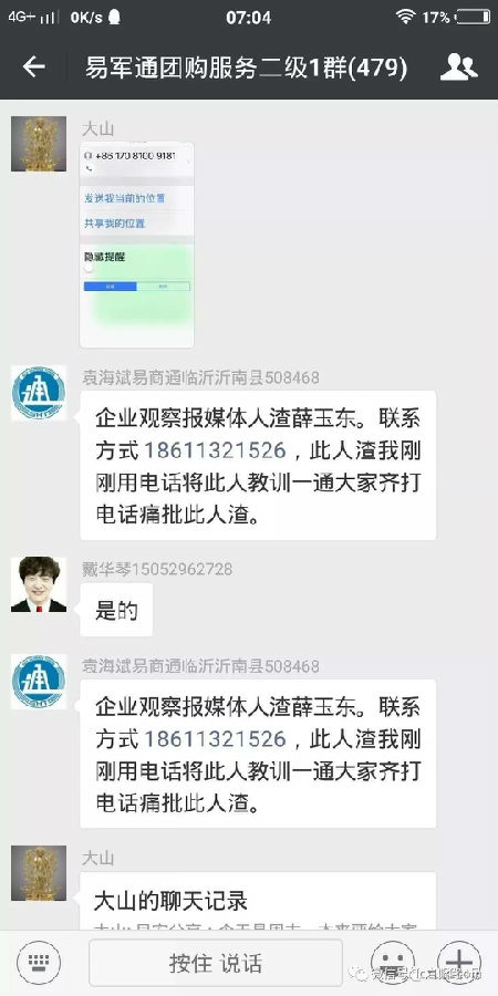 其中,在贴吧和微信群中质疑易商通的人,会被称为“负能量”,是需要打击的对象。在一个叫作“易军通团购服务二级1群”的微信群中,有人公布了一个“负能量”的联系方式,表示“不能让他坏了我们公司的名誉”。还有人则公开了一位曾报道易商通的记者的联系方式,表示“此人渣我刚刚用电话教训一通”,号召其他人“齐打电话痛批此人渣”。