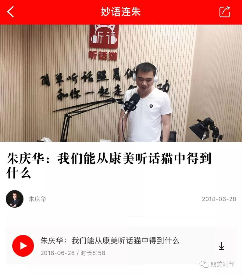 2018年6月27日,在“康美事业加油站”正式开播之际,朱总从广州赶赴重庆,亲临“听话猫”总部,亲自走进录音室,通过定制页面里的“妙语连朱”专栏连线康美全体事业伙伴,以“我们能从康美听话猫中得到什么”为主题倾情开讲!