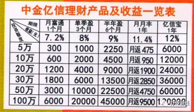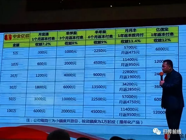 会场由中金亿信金牌讲师吕(音)总对中金亿信的理财产品进行详细的讲解,吕总在会上对大家说:“中金亿信理财产品分:月富通1个月利率收益7.2%、单季盈3个月利率收益8%、半年盈6个月利率收益9%、月月丰1年利率收益11.4%、亿信宝1年利率收益12%。理财产品最长时间是一年,最短是一个月,每周三是小额度开放日,投资额度限1万起,仅限年化产品。”
