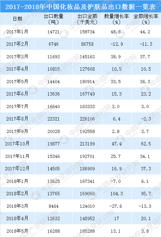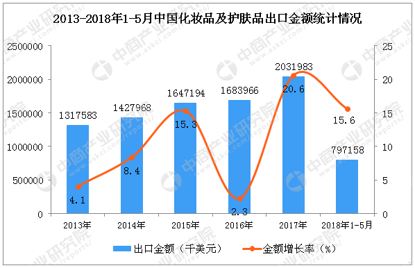 2018年1-4月中国美容化妆品及护肤品出口金额为7.97亿美元,同比增长15.6%;纵观近五年中国美容化妆品及护肤品出口金额情况,年均复合增长率为11.44%。