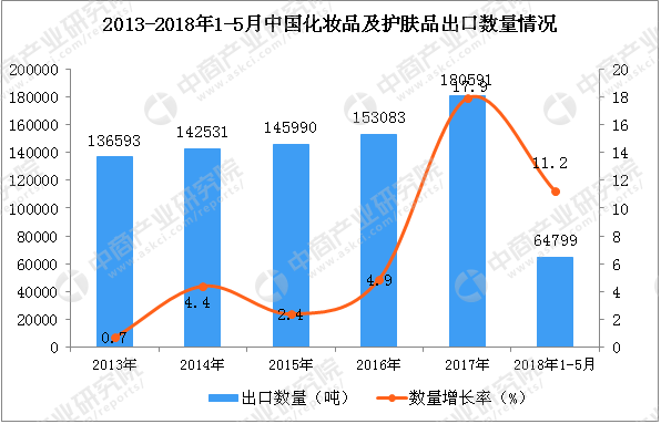 直销行业网讯 据中商产业研究院数据库数据显示,2018年1-5月中国出口美容化妆品及护肤品6.5万吨,同比增长11.2%;纵观近五年中国美容化妆品及护肤品出口数量情况,年均复合增长率为7.23%。