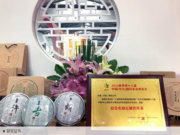 直销行业网讯 6月21—24日,由中山市茶业协会、中山日报报业集团共同承办的“2018春季第十八届中国(中山)国际茶业博览会”在中山博览中心顺利举行。会上,“久香陈韵完美百家普洱茶”凭借古朴的韵味和独到的魅力,荣获2018春季第十八届中国(中山)国际茶业博览会“最受欢迎定制普洱茶”奖。