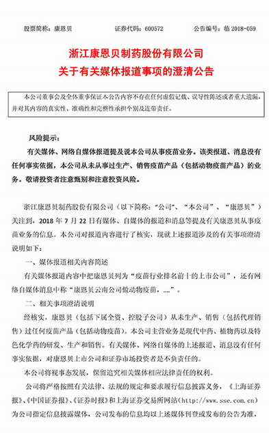 康恩贝在公告中表示,该公司关注到,2018年7月22日,有媒体、自媒体的报道和消息等提及有关康恩贝从事疫苗业务的信息,把康恩贝列为“疫苗行业排名前十的上市公司”,还有网络自媒体消息中称“康恩贝云南公司做动物疫苗….”。