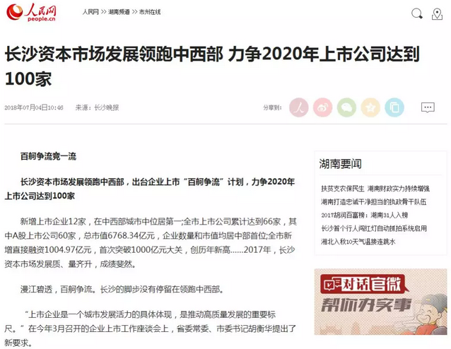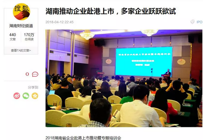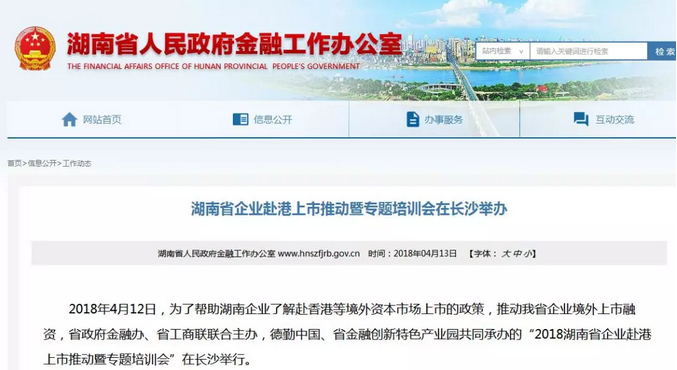 2018年4月,湖南省政府金融办、湖南省工商联联合主办,湖南省金融创新特色产业园承办的“2018湖南省企业赴港上市推动暨专题培训会”在长沙举行。旨在帮助湖南企业了解赴香港等境外资本市场的上市政策,推动全省企业加快境外上市融资步伐。