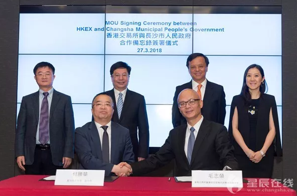 2018年3月,长沙市人民政府与香港交易及结算所有限公司签署合作备忘录,中共湖南省委常委、长沙市委书记胡衡华及香港交易所集团行政总裁李小加见证签署。中共长沙市委常委、副市长付胜华与香港交易所董事总经理兼内地业务发展主管毛志荣分别代表双方签署备忘录。据悉,这是香港交易所首次与内地省会城市签署合作协议,也是香港交易所有关上市制度改革后首次与内地政府签署合作协议。双方表示,将以此次签约为契机,加强信息沟通、政策对接、业务培训,形成企业上市交流合作常态化机制,共同为资本市场发展贡献力量。