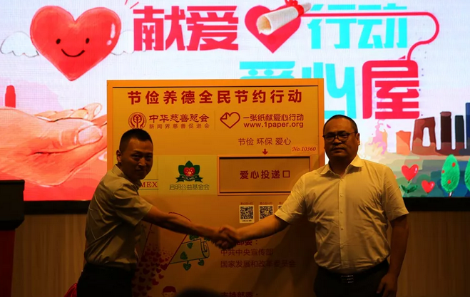 杨庆明宣布“一张纸献爱心行动”现场投放活动正式开始,在副理事长安凯的带领下,现场嘉宾排队把怀抱的一沓沓废旧报纸塞入爱心屋内,为急需救助的困难群体献上了一份爱心与真情。