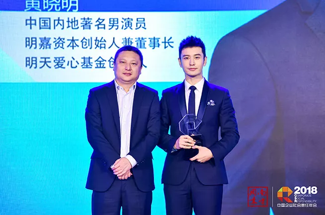 中国内地著名男演员、明嘉资本创始人兼董事长、明天爱心基金创始人黄晓明获颁2018年度责任先锋