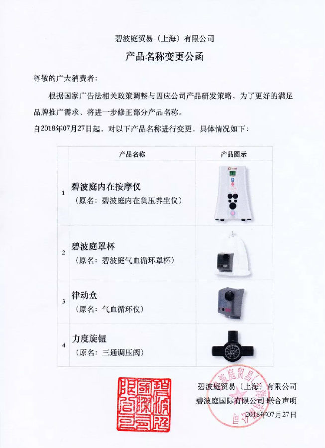 直销行业网讯 根据国家广告法相关政策调整与因应公司产品研发策略,为了更好的满足消费者与品牌推广需求,碧波庭内在负压养生仪全面更名为碧波庭内在按摩仪。