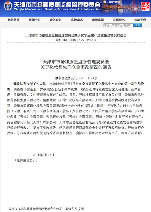 详见7月27日:天津市市场和质量监督管理委员会关于化妆品生产企业整改情况的通告 (津市场监管药化〔2018〕23号)