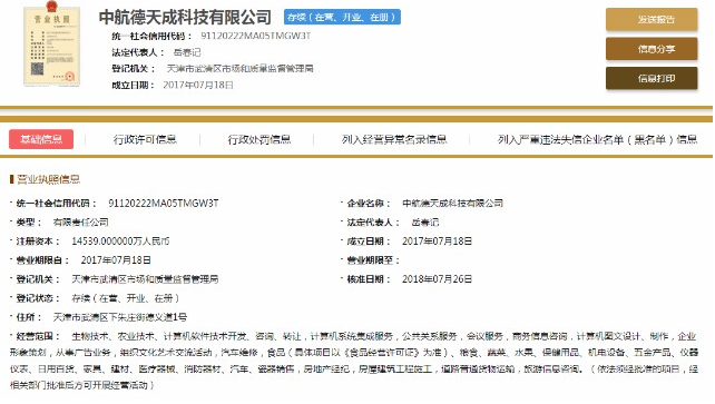 直销头条网编辑在国家企业信用信息公示系统查询到中航德天成成立于2017年07月18日,注册资金14539万人民币。法人代表岳春记,执行董事宋德顺,经理岳春记,监事赵艳辉,自然股东有马素红、宋德顺、杜林英。