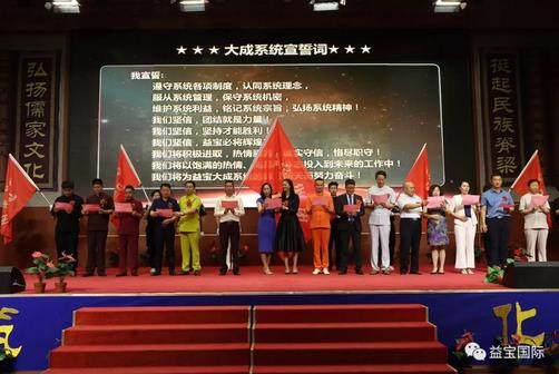 大成系统是用儒家思想贯穿于整个系统文化,培养“儒商、仁德、精进、修养、高尚”的成功人士。打造一支儒商、健康、富有、快乐的高素质团队,利用大成系统造就出大成就的人才。会上隆重举行了大成系统庄严的授旗仪式。