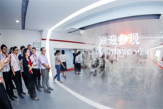 进入口服液智能制造大楼参观走廊,投影在干雾上的欢迎语让我们忍不住“哇”出来。