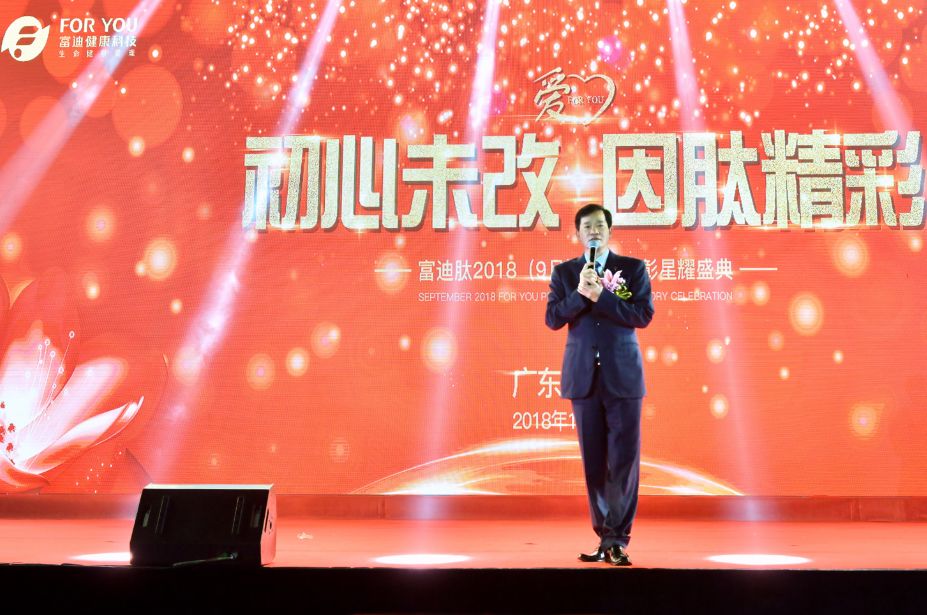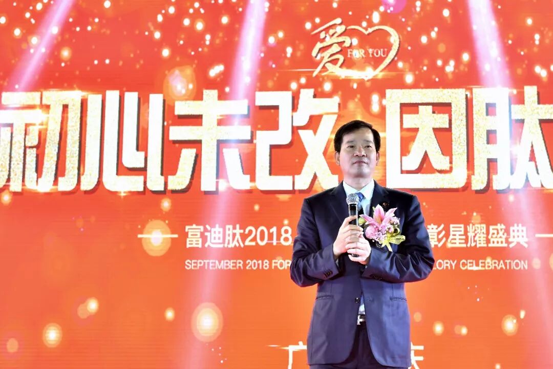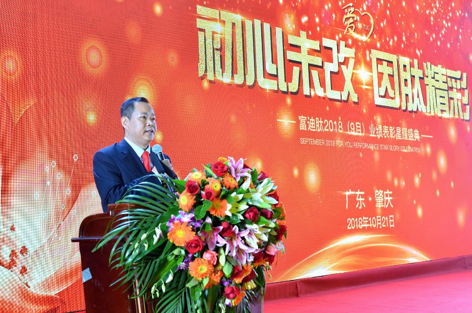 作为富佑集团董事局主席,陈怀德先生在致辞时激情满怀地说:今天,来自全国各地的2000多位富迪家人共聚一堂,我代表富迪公司和公司全体员工表示最热烈的欢迎和最衷心的感谢!上个月的16号,我们在山水洲城长沙举行了“富迪肽”的8月份业绩表彰星耀盛典,短短一个月时间里我们又在肇庆举办业绩表彰庆典,在这么一个特别的日子里,发自内心感恩感谢为富迪的事业作出了卓越贡献的市场领导人和公司的全体员工,是他们的辛勤付出,用全身心去传播富迪这个大爱的事业,才有了富迪今天的成绩。