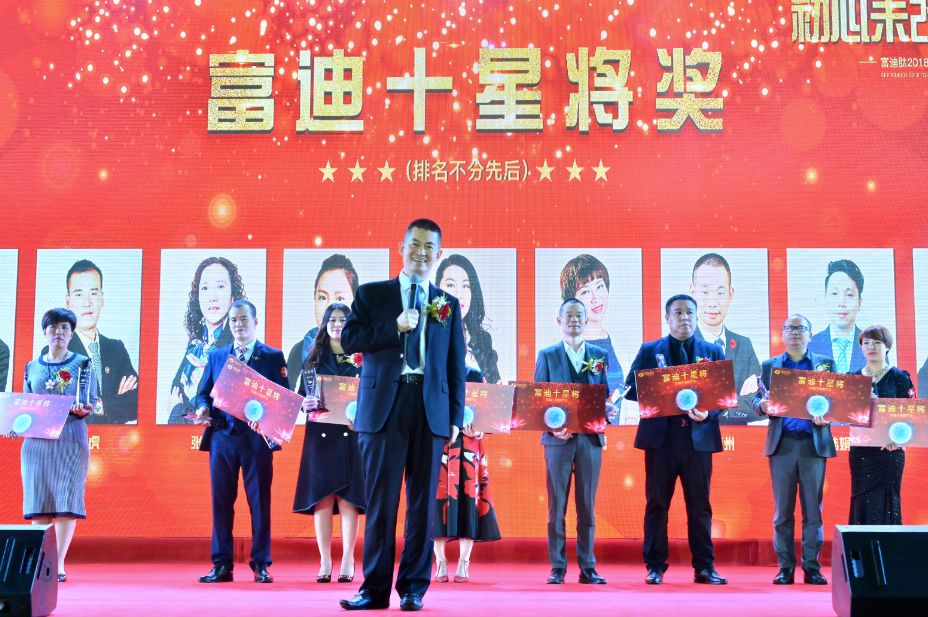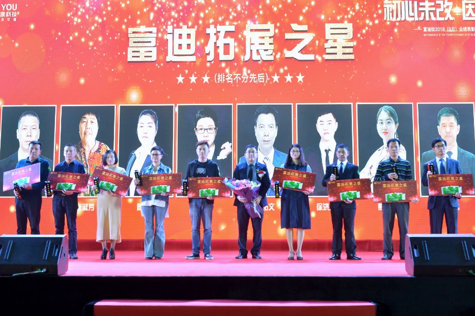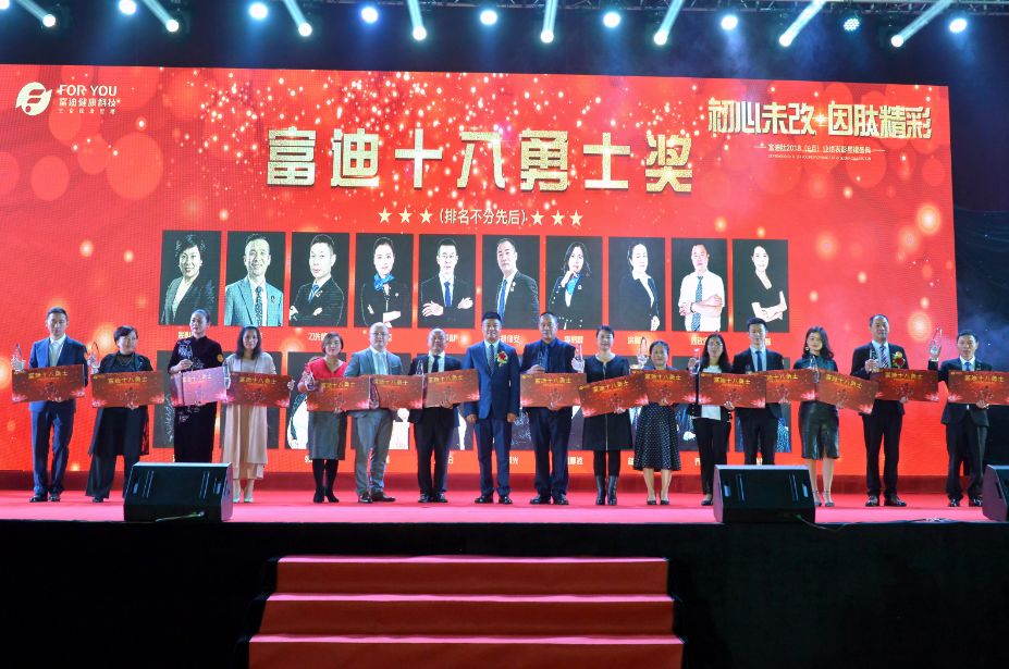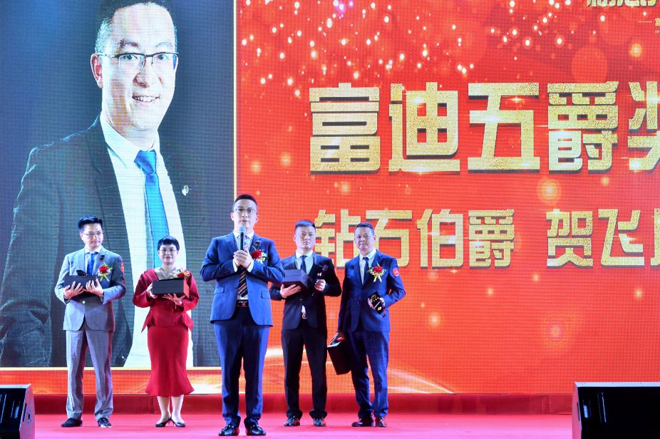 风云冕功勋,名满誉星徽。星耀盛典上,富佑集团高管为鞠躬尽瘁的富迪家人们颁发了“富迪五爵奖”“富迪十星将”“富迪十八勇士奖”“富迪百强精英奖”和“富迪拓展之星”等奖项。献给他们的是最瞩目的舞台,最耀眼的荣誉,最豪华的大礼。是他们这一群人,肩上有担当、心中有阳光、脚下有力量,是他们用实力赢得尊严、用真诚赢得尊重、用爱心博得天下,用坚持成就富迪。富迪人在奋斗的路上张扬着一身傲骨风华,是用心做好当下,用行动诠释灵魂,他们身上所具有的,是进取的锐气,是忘我的精神,是大爱的胸怀。