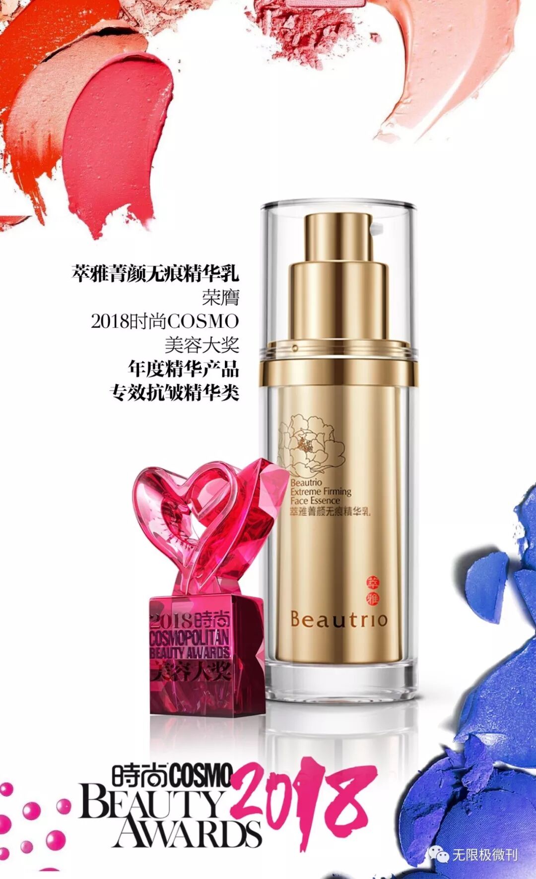 近日,权威时尚媒体《时尚COSMO》公布了“2018时尚COSMO美容大奖”,萃雅菁颜无痕精华乳荣获“护肤类-年度精华产品-专效抗皱精华类”大奖!