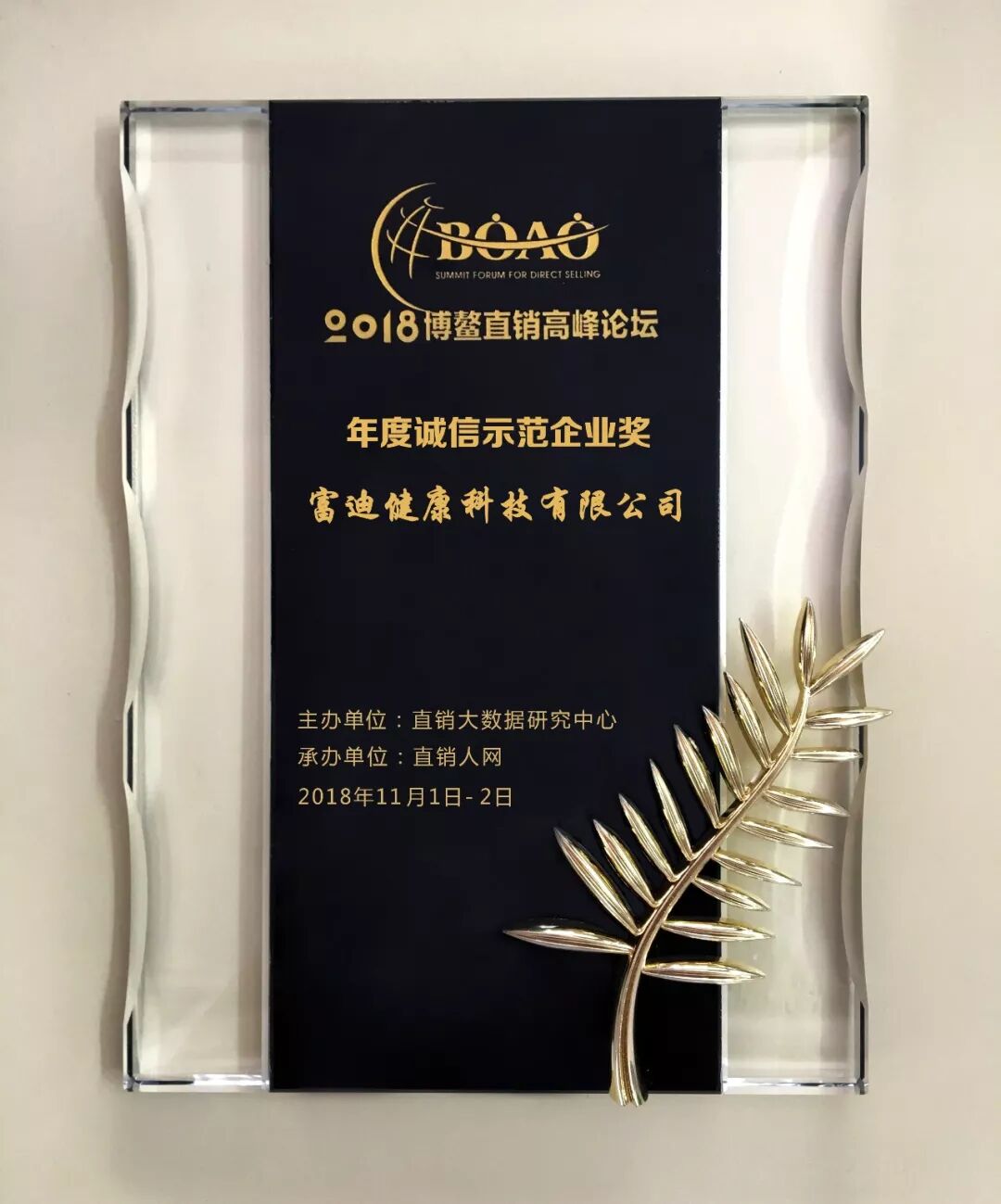 本届论坛会议中隆重揭晓了2018年度“金顶奖”的评选结果。“金顶奖”以最专业的平台和最公正的评选方式,评选出本年度直销行业中的精英企业、优秀团队、杰出个人,为广大直销从业者提供具有参考价值的创业风向标。其中,连续八届荣膺“中国十大慈善家”、中国经济十大商业领袖、中国扶贫开发协会副会长、全国工商联美容化妆品业商会副会长、民建中央对外联络部副部长、广东省第十二届人大代表、富佑集团董事局主席陈怀德先生荣获2018博鳌直销高峰论坛“年度影响力企业家奖”;富迪健康科技有限公司荣获2018博鳌直销高峰论坛“年度诚信示范企业奖”;富迪肽荣获2018博鳌直销高峰论坛“中国直销卓越品牌奖”。