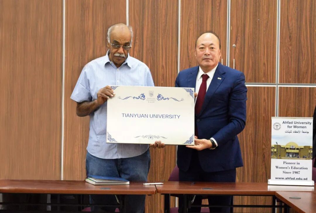 李金元董事长(右)向加西姆尤瑟夫校长(左)致赠天元大学牌匾