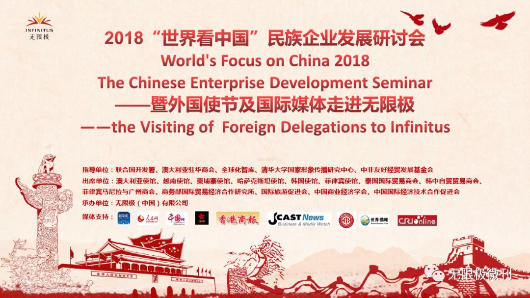 11月27~28日,由联合国开发计划署、全球化智库等作为指导单位,新华社特约支持,无限极(中国)有限公司承办的2018“世界看中国”民族企业发展研讨会暨外国使节及国际媒体走进无限极活动,在广东江门成功举办。