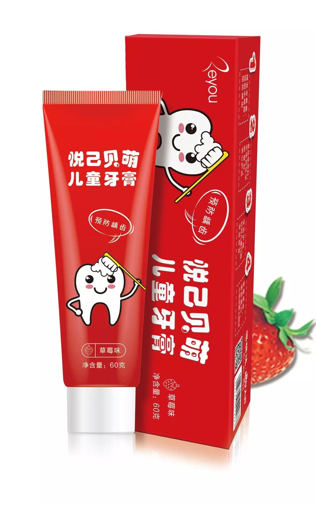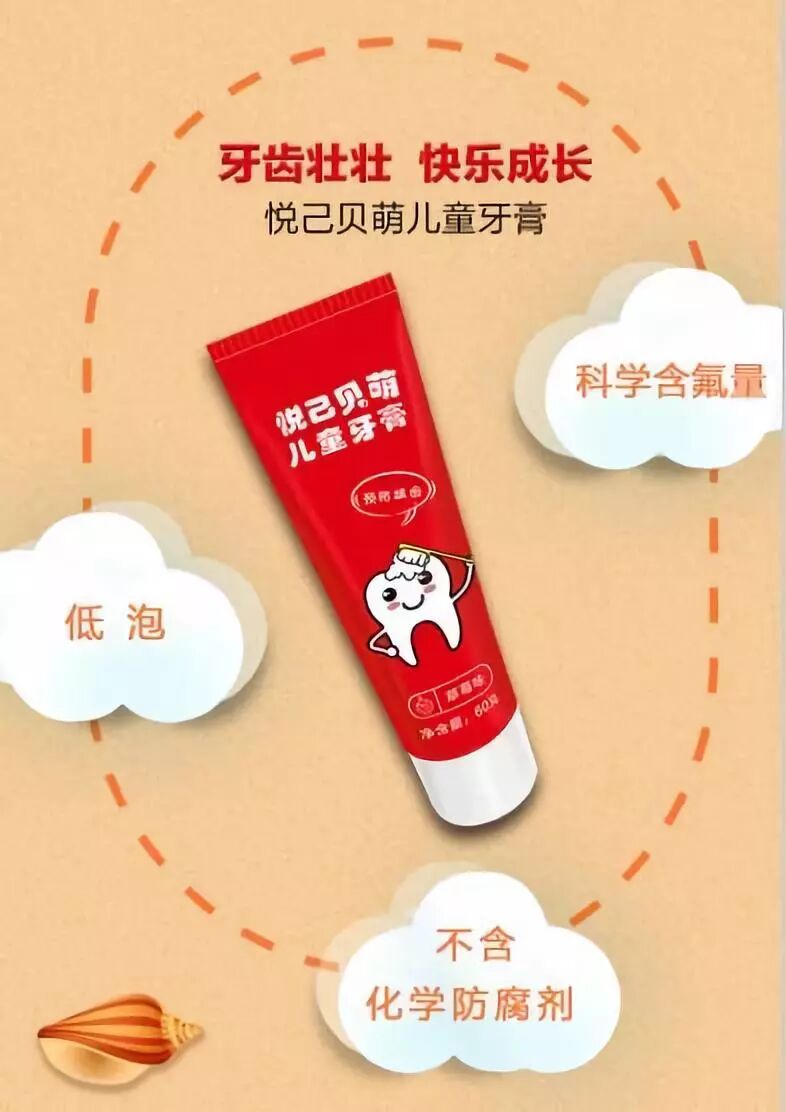 红色的外衣,代表生命的蓬勃有力,也与它香甜的草莓味相呼应。卡通牙齿形象象征着一口健康好牙,也表明了悦己贝萌儿童牙膏是保卫孩子牙齿的忠诚小卫士。