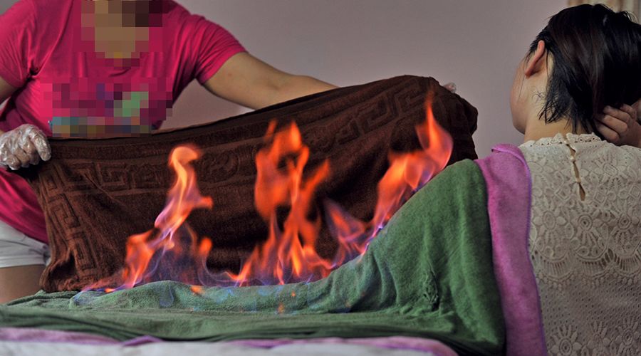 他们将顾客包裹在塑料膜和毛巾里,点燃酒精的熊熊火焰,劝诫说「湿气很重,多做火疗」。