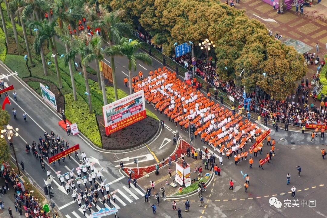 古润金董事长率领360名完美员工迈出公益步伐,组成“完美”字型方阵,在《我们与爱同行》的激情乐曲中列队前行,践行中山精神、共建博爱家园。