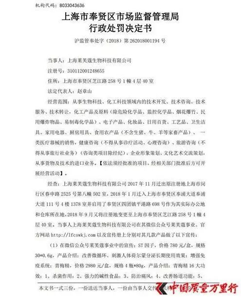针对莱芙蔻宣传方面的违规行为,上海市奉贤区市场监督管理局近期发布行政处罚决定书,对其以多款产品存在虚假宣传处以43800元的罚款。