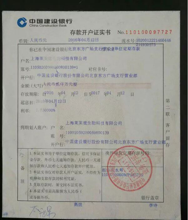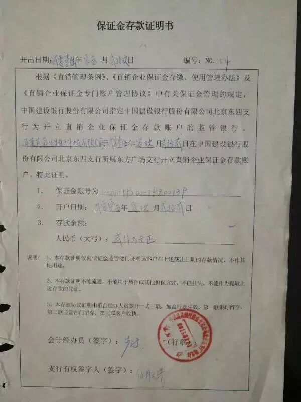 据发现,《保证金存款证明书》显示,开户日期为2015年9月22日,开出日期为2016年3月29日。编号为154。《存款开户证实书》显示,存放期限为2016年4月12日至2017年4月12日,总共一年时间。据此,有李姓经销商在宣传时向别人表示:“这是公司的保证金手续,你可以用作团队内部了解,今年百分百直销牌照下来。”