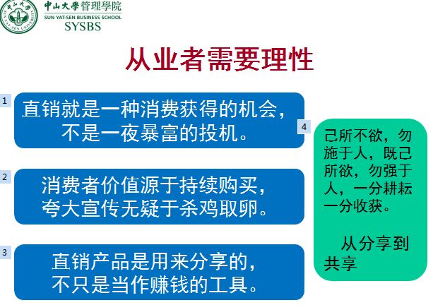 直销从业者需要理性,直销只是一种普通的盈利方式,不应该带有一夜暴富的想法,夸大宣传保健品功效无异于杀鸡取卵;