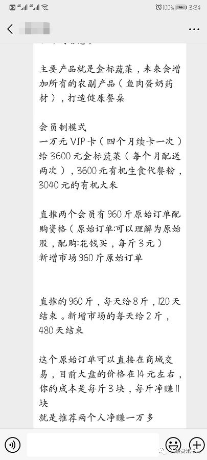 据刘某介绍,成为会员后,需要直推两个会员,就有960斤原始订单配购资格。“原始订单你也可以理解为原始股。”刘某说,“有了购买原始股的资格,你就可以以3块钱每斤的价格购买,但每天只能购买8斤,分120天买完全部的960斤。”