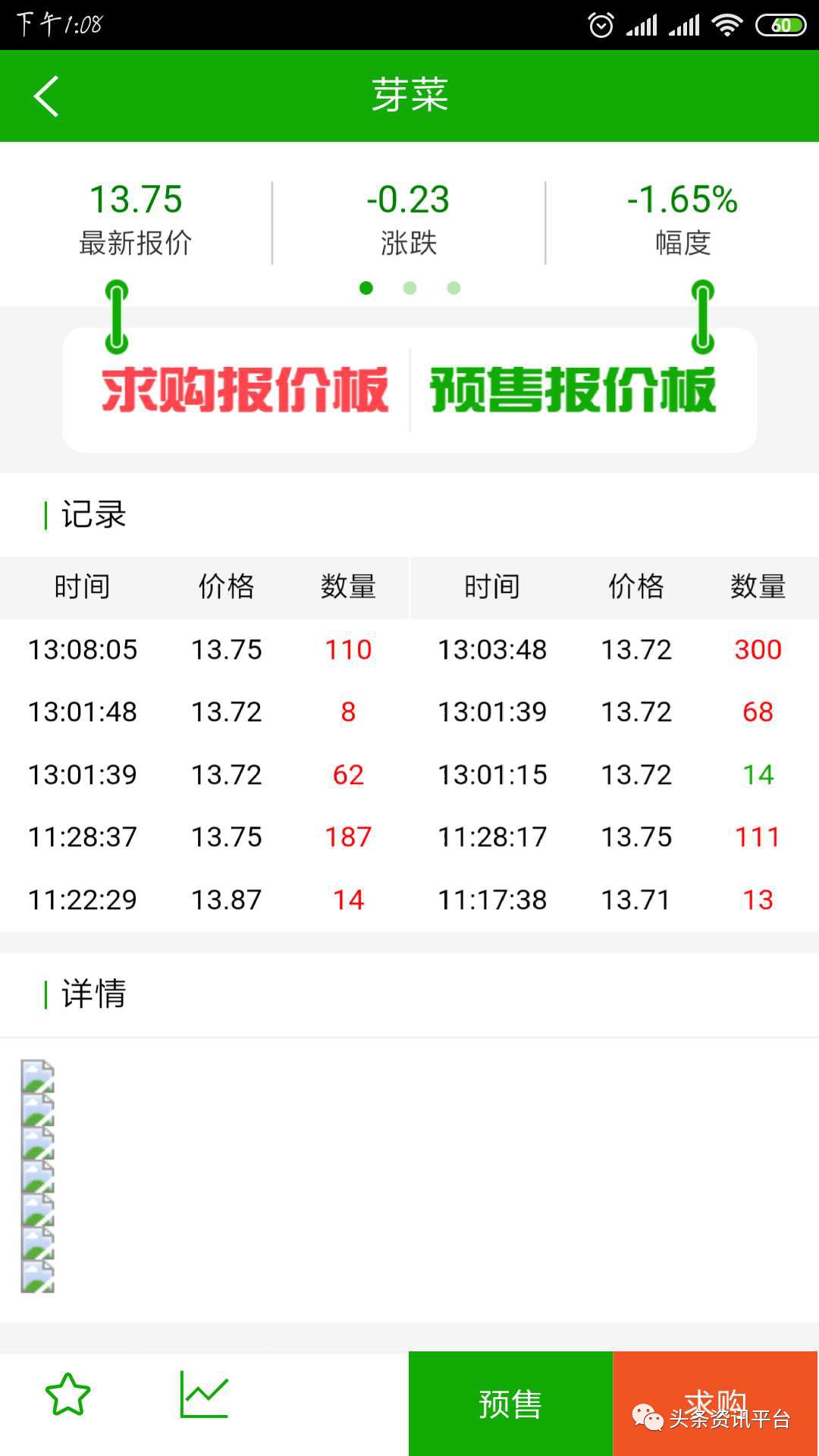 但最核心的内容需要注册、购买成为会员之后才能够体验。经过调查后发现,成为会员后,商城上有一个菜品实时交易平台,类似于股票、现货期货交易的一个价格涨跌大盘,实时监控菜品价格,据团队领导人刘某介绍:“每天中午12点停盘,可随时交易,但是品种只有芽菜一种,如果要提现的话,资金需冻结一天。”