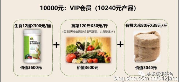 为了消除这种疑虑和担心,SMART农场项目经销商小刘表示:“你开会员卡,我们就会送3600元金标蔬菜,3600元有机生食代餐粉,3040元有机大米。这样算下来,一共给了你10240元产品。”