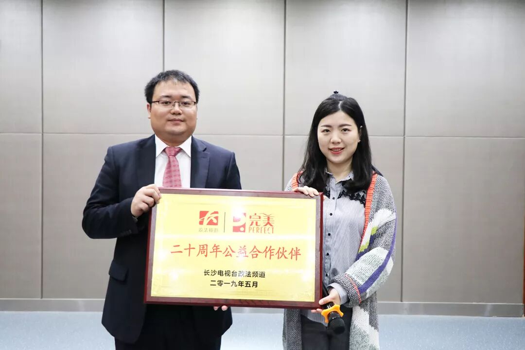 长沙政法频道经营中心主任唐庆庆在发言中表达了希望在未来的日子里与完美公司进行更多的合作,共同推进公益事业的发展,同时也呼吁更多的人关注并加入公益事业。在发言结束后唐庆庆代表长沙政法频道为完美湖南分公司颁发“20周年公益合作伙伴”的奖牌。