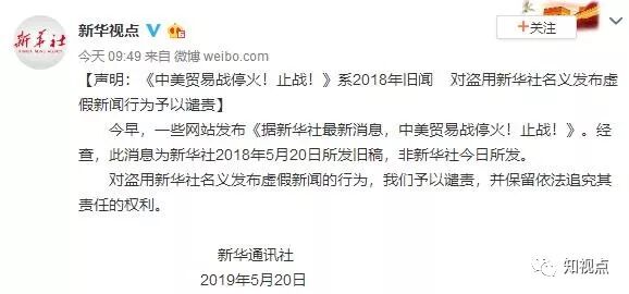 5月20日,新华通讯社通过官微发布的一则谴责声明引发广泛关注。声明全文如下: 今早,一些网站发布《据新华社最新消息,中美贸易战停火!止战!》。经查,此消息为新华社2018年5月20日所发旧稿,非新华社今日所发。对盗用新华社名义发布虚假新闻的行为,我们予以谴责,并保留依法追究其责任的权利。