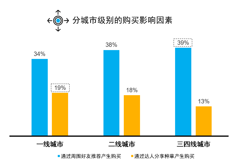 进一步来看,三线城市更多信赖身边好友推荐,而一二线城市更容易受到达人/KOL种草的影响。主要原因是由于下线人群接触网络社交渠道相对较单一,相比较而言,基于周围亲朋好友的社会关系更为紧密;而一二线城市消费者的线上社交及交友渠道更加多元,所以更容易接受线上达人/KOL的推荐而产生非计划性购买。
