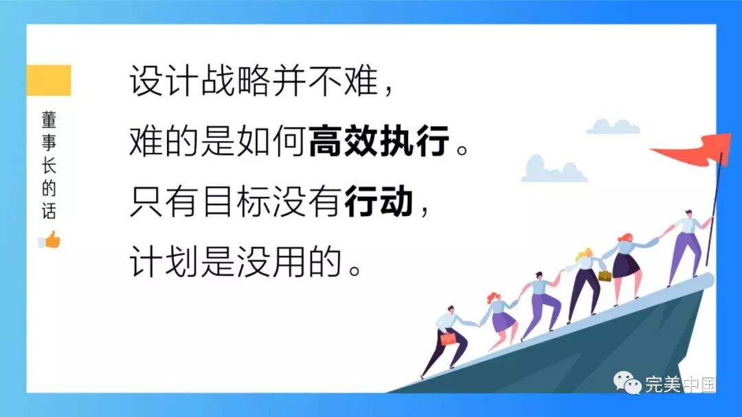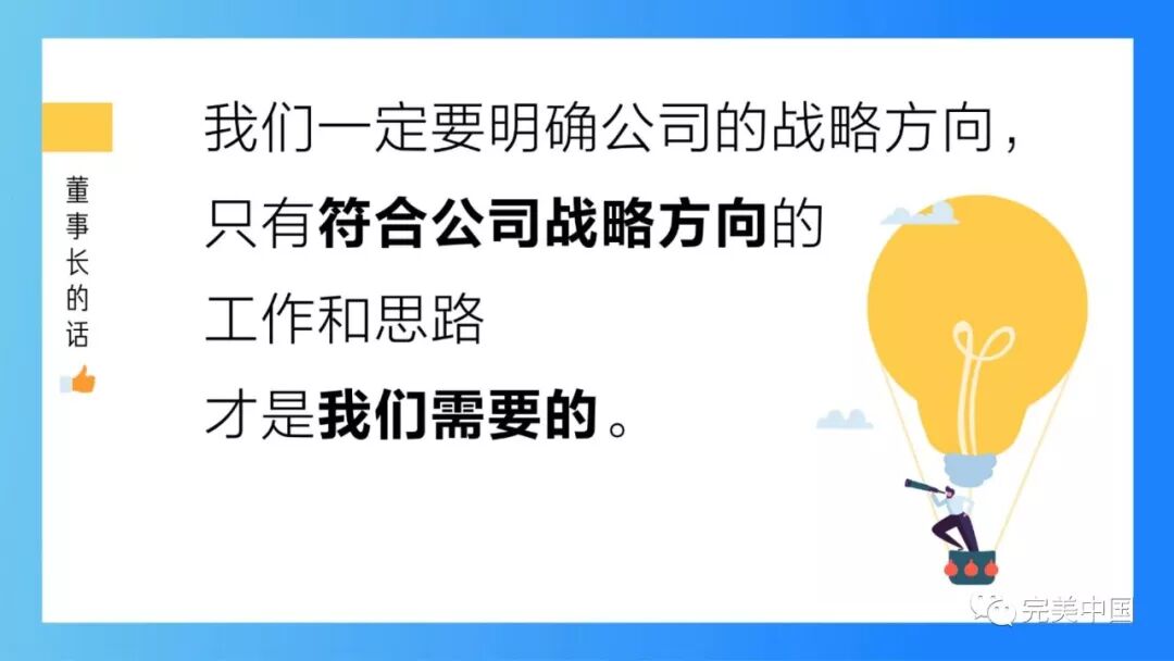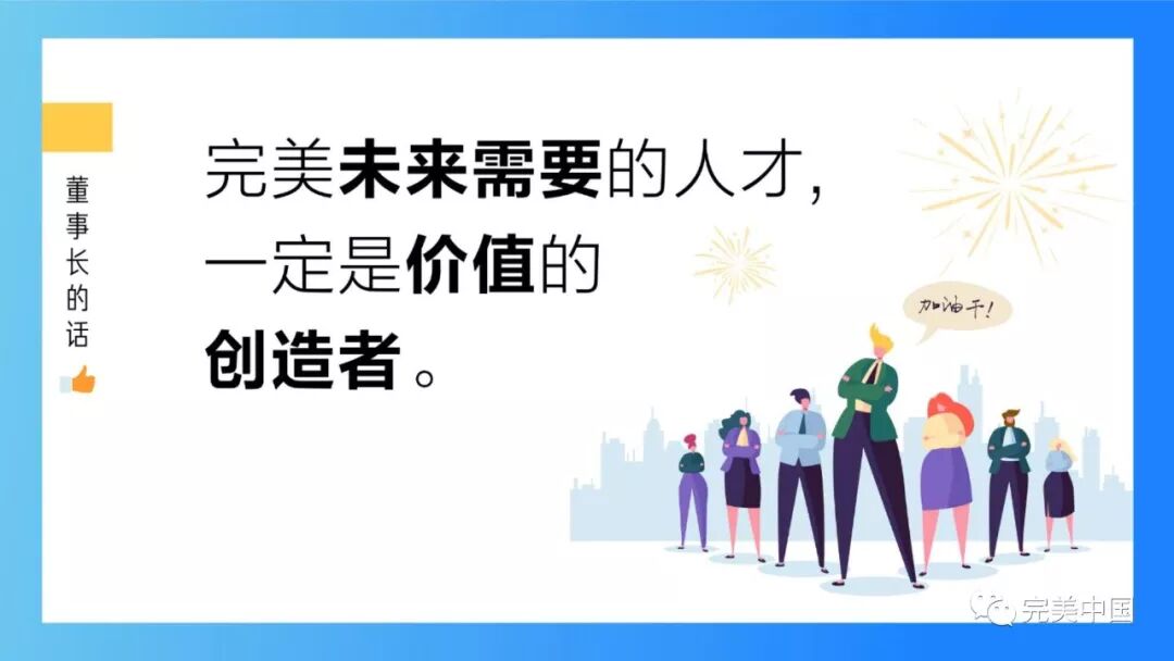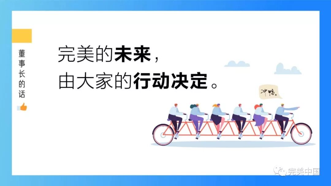 公司转型升级,已经确定了“技术创新、健康美丽、卓越服务”的全新愿景,致力以技术创新驱动,成为全人类健康美丽服务的卓越提供者,并从去年就开始进行数字化转型的工作。 为实现长远发展战略,公司将坚持两个转变:一是从以产品为中心向以客户为中心转变,二是从追求业绩向追求客户价值转变。客户是完美生存的根基,满足客户需求、提升客户价值,是公司未来发展的原动力。坚持以客户为中心的转变,一定要落实到我们的行动上,而不只是一句口号。 经过一年多的努力,公司确定了全新的战略愿景,这也是公司未来的发展方向。有了目标,接下来的关键就在于如何落实到我们每一个人的行动上。 公司在年初已经公布了科学化的管理方案,也逐步进行了组织架构的改革,打破传统,建立全新的、为业务发展服务的网络型架构,将合适的人才放在合适的岗位,共同打造完美的未来! 机会从来都是留给有准备的人,公司未来需要的人才,一定是能够不断创新思维、努力学习、提升自我、勇于担当的人。 所以,大家一定要跨出自己的舒适圈,主动拥抱变化,将问题到“我”为止,责任从“我”做起,统一思想,全力为市场发展服务,迎接完美的未来! 完美正在以全新的姿态走进25周年,我们憧憬美好的未来,公司也有信心带大家开启一个新的世界,创造新的未来,前提是我们自己必须有所改变。至少,是改变我们自己眼中的世界。内心有希望、有目标、有行动,才有前进的动力和价值。 公司的未来属于每一个有理想、有抱负的完美人,如果我们都能热爱完美、齐心协力,能够积极主动、提升自我,共同把完美事业做大做强,相信完美的未来一定会无限广阔,我们每个人的收获也会更加完美!