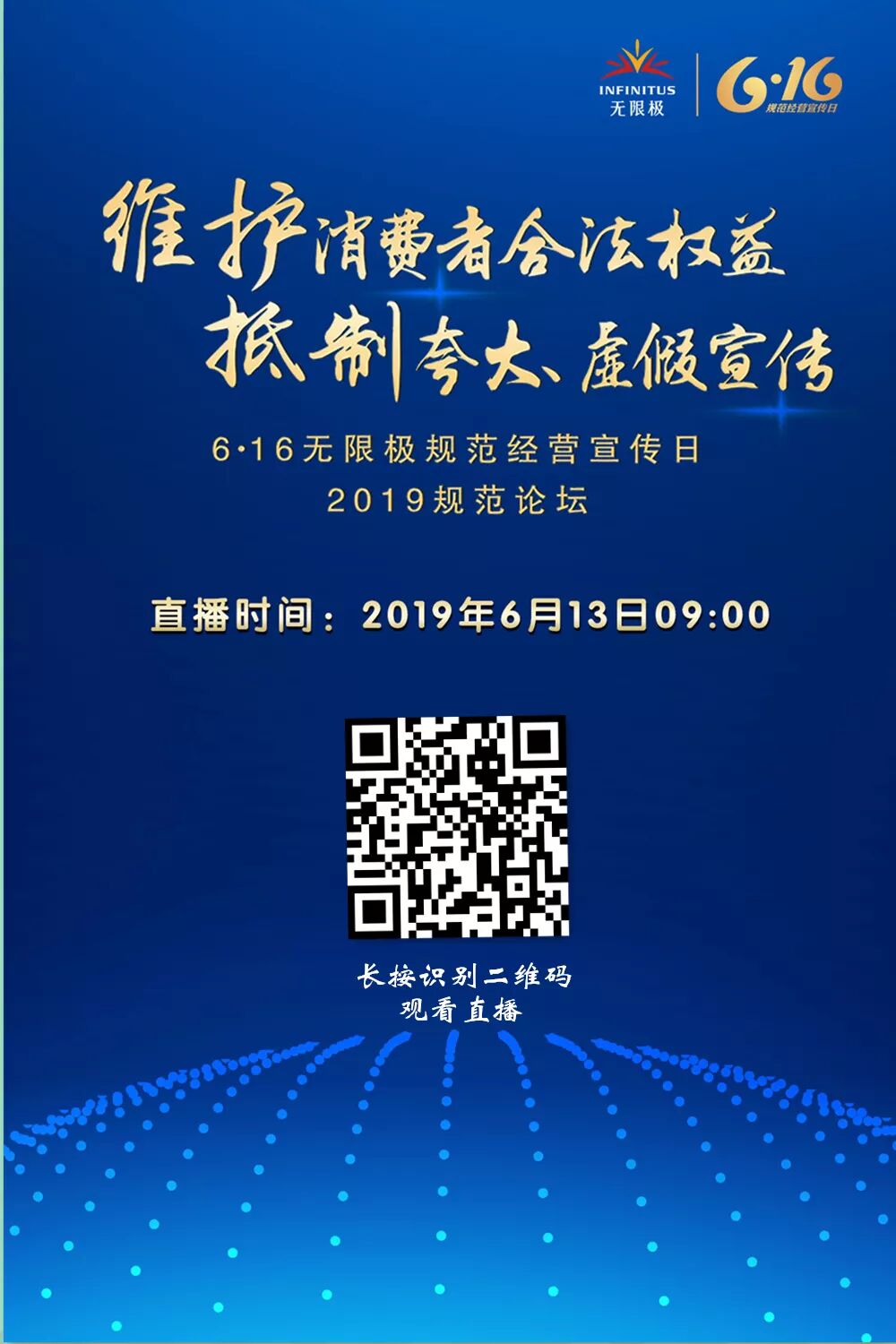 长按并识别上方二维码 制作你的专属“规范承诺”海报 让我们一起凝心聚力,共同承诺: 维护消费者合法权益 抵制夸大、虚假宣传 6月13日上午9:00,“2019规范论坛”将开始进行视频直播,同时开始“抢红包”活动,届时通过微信公众号“无限极微刊”“无限极业务导航”“无限极服务”,以及无限极网站、无限极盒子二代均可观看直播,敬请关注! ✱现场直播+抢红包、分会场连线互动 ✱同步开设6•16在线聊天室,规范大家谈,热点话题嘉宾应答 维护消费者合法权益, 抵制夸大、虚假宣传, 共创和谐经营环境, 期待你的参与!
