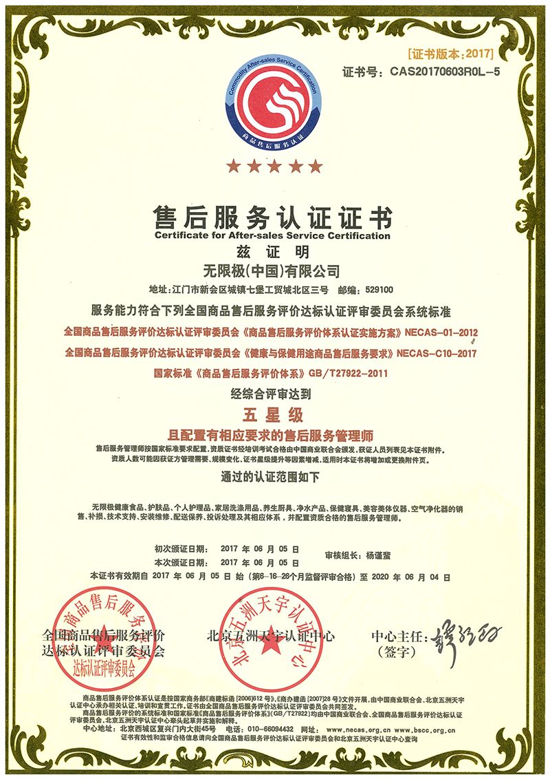 售后服务认证是由国家商务部发文开展的全行业服务认证。北京五洲天宇认证中心是国家商务部独家授权、国家认监委批准成立的评审机构。简单来说,就是由中立权威的第三方机构,对企业的售后服务能力进行审核,对服务水平做出评价。 评审期间,认证机构严格依照国家标准《商品售后服务评价体系》,采用现场评审、客户暗访、秘密体验等方式,对公司全系列产品的销售、补损、技术支持、安装维修、投诉处理及其管理体系进行了严格的考核,了解企业最真实的运行状态。初审之后,专家评审委员会(由国家相关政府机构的工作人员以及专家学者组成)还会进行二次评定。 自2017年5月获得五星售后服务认证后,公司长期接受认证机构的监督。每年,北京五洲天宇认证中心都会对企业进行全面、严格和公正的复审,以保证企业能够保持高水平的售后服务,保障消费者的权益。 连续三年获得五星售后服务认证,将鞭策无限极以更积极的行动,继续提升服务质量,为消费者提供更爽的体验。