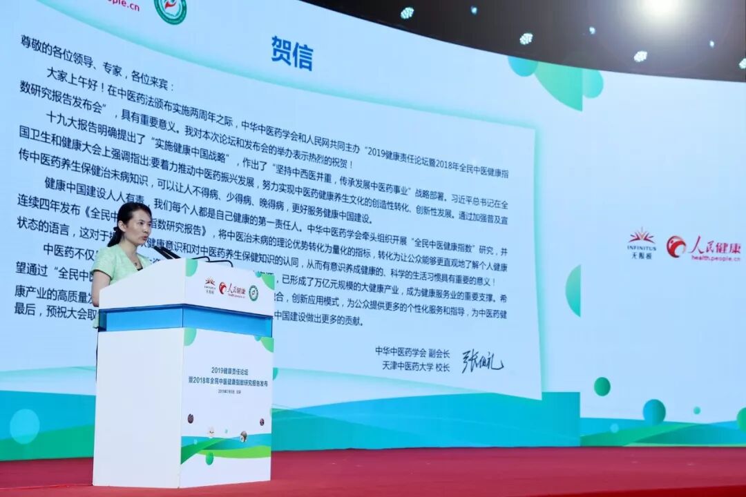 中国中医科学院院长、中国工程院院士张伯礼先生特意发来贺信,由中华中医药学会学术部主任庄乾竹女士代读,他说:“连续四年发布的《全民中医健康指数研究报告》,将中医治未病的理论优势转化为量化的指标,转化为让公众能够更直观地了解个人健康状态的语言,这对于提升公众健康意识和对中医药养生保健知识的认同,从而有意识养成健康的、科学的生活习惯具有重要的意义。”